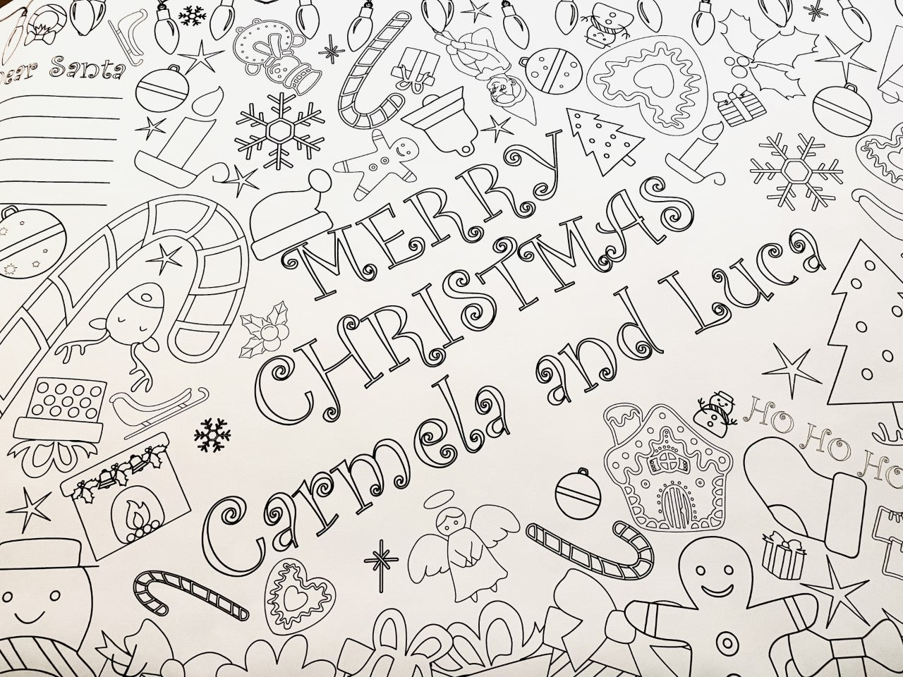 1 Personalized Christmas Coloring Tablecloth (3' x 6') Oversized, holiday-themed coloring tablecloth that covers most tables and keeps kids and adults coloring together for hours.