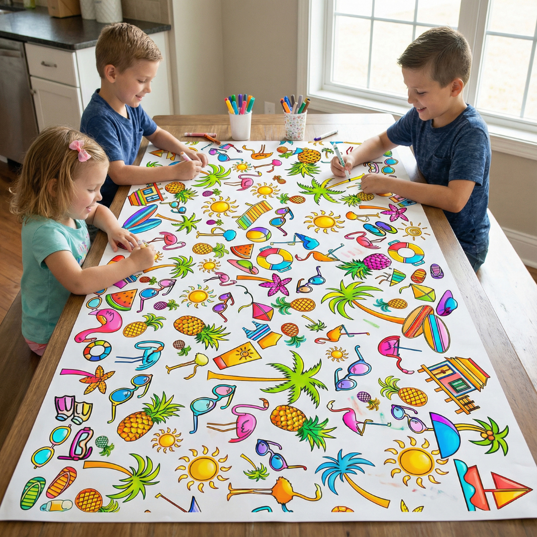 Each month, you’ll get a giant 36" × 72" coloring tablecloth that turns chaos into connection.