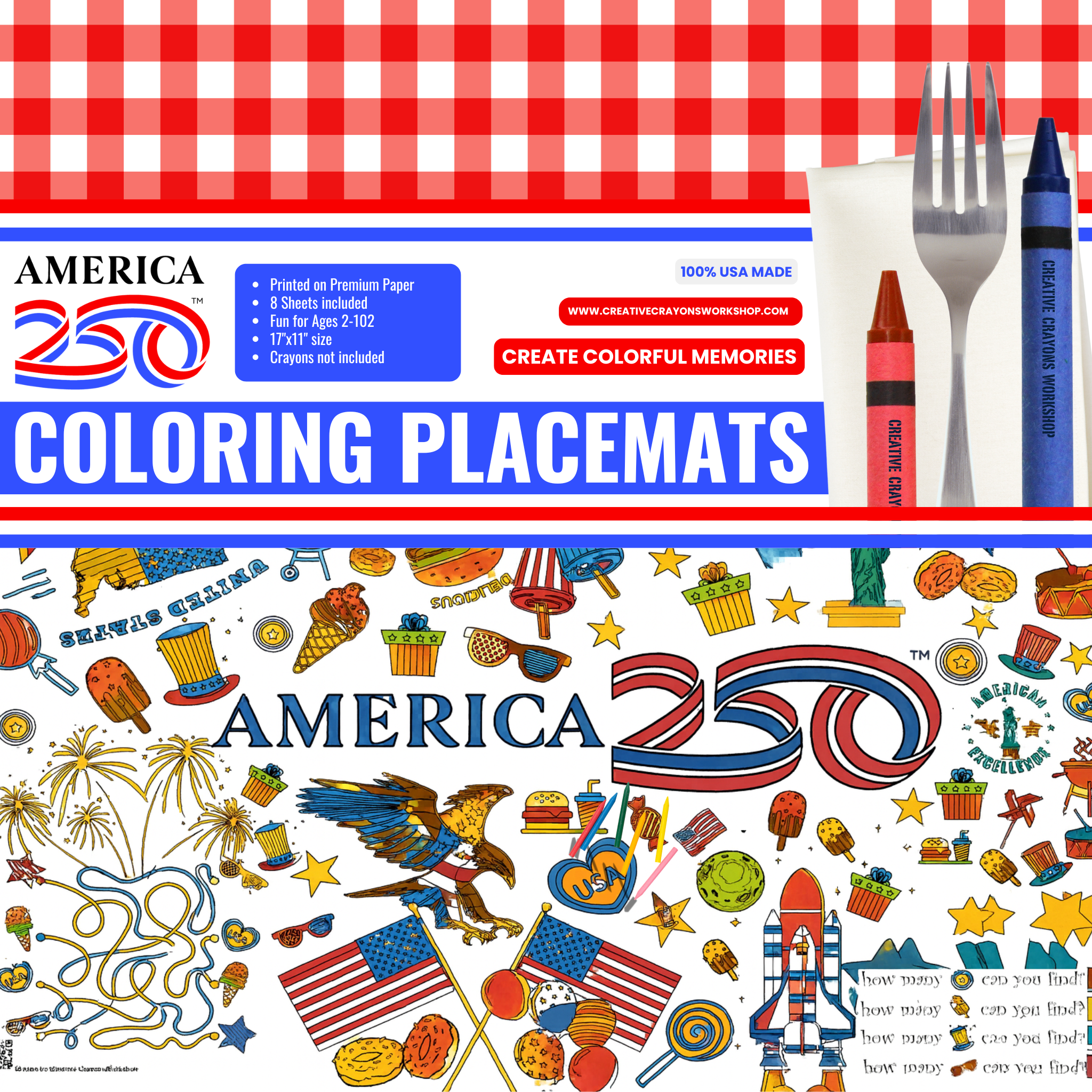Turn any table into a mini art studio with our America 250 Coloring Placemat Pack, designed to make this once-in-a-lifetime celebration both fun and meaningful. Each placemat features patriotic designs that invite kids and adults alike to color, connect, and celebrate together. Perfect for family dinners, classroom activities, or Fourth of July-style gatherings honoring America’s 250th birthday.