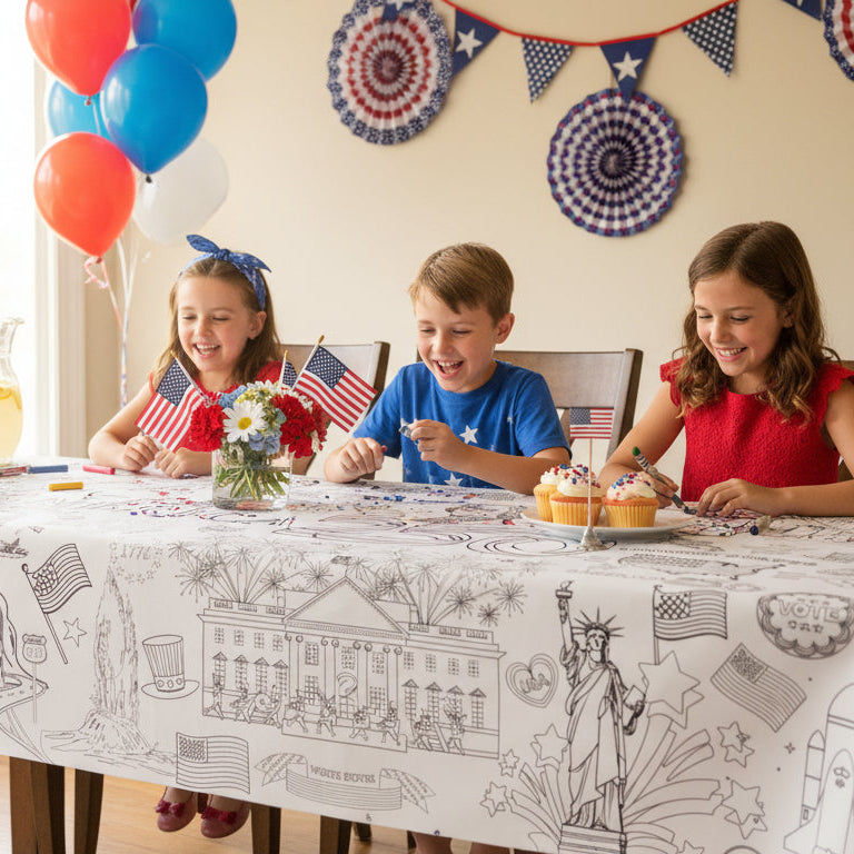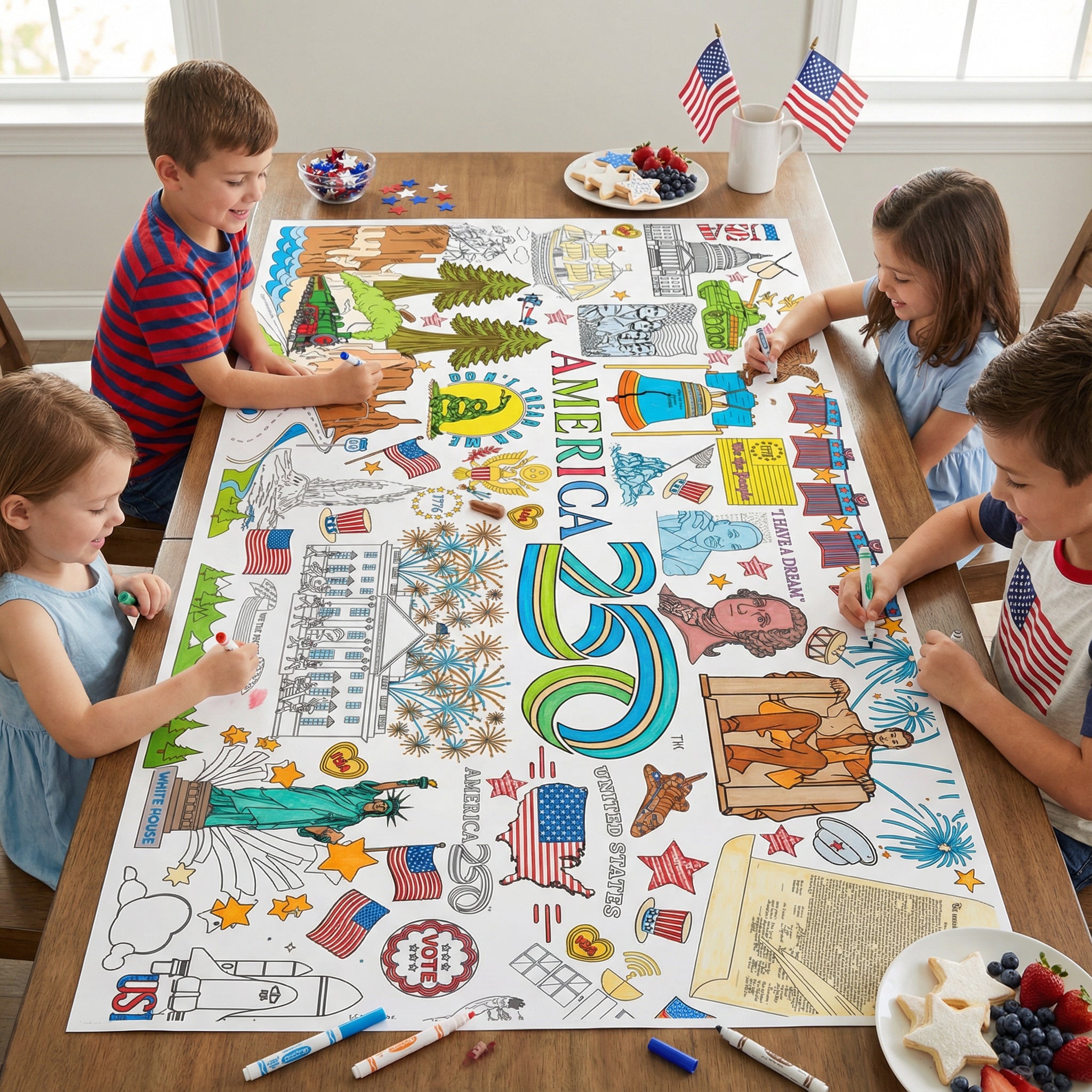 Bring everyone together around the table for this once-in-a-lifetime celebration. Our America 250 Coloring Tablecloth turns your gathering into a shared masterpiece, the perfect mix of fun, nostalgia, and national pride. Kids, parents, and grandparents alike can color their way through iconic American landmarks, symbols, and patriotic designs while making memories that last long after the crayons are put away.